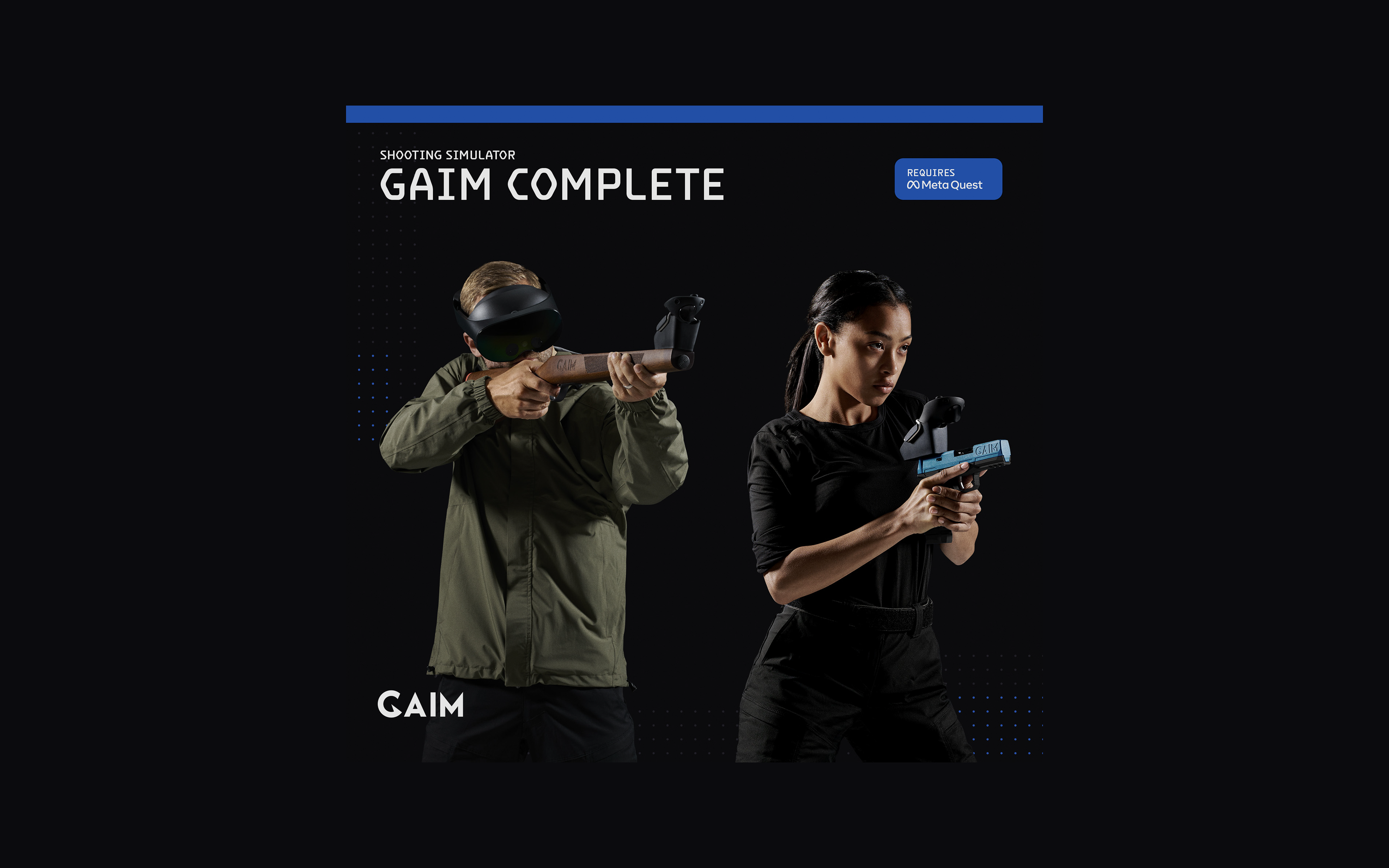 The GAIM Complete package includes all our available software at the time of purchase, the GAIM Wooden Rifle, the GAIM Training Handgun and two Trigger Gen 2. One for each firearm controller. * GAIM is currently compatible with Meta Quest 2, Quest 3 and Quest Pro. GAIM Range is not included in GAIM Complete.